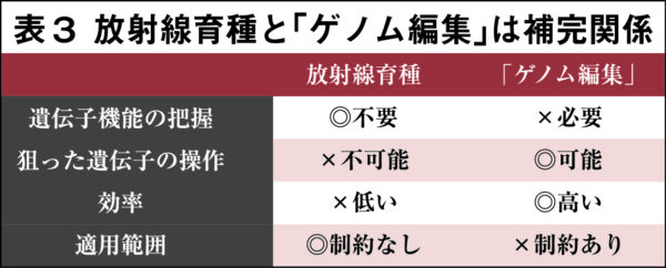 放射線育種と「ゲノム編集」が一体のものとして出てくる可能性がある。日本が「ゲノム編集」で突出したのは、世界でも突出した放射線育種大国であったからだと考えられる。「ゲノム編集」は「万能の遺伝子操作技術」といういい方をするが、実際は万能ではなく、けっこう限定がある。放射線育種が得意なものは「ゲノム編集」は得意でない/ゲノム編集が得意なものは放射線育種は得意でないという関係だ【表3】。だから互いに欠点を補いあうと、とても強力なツールになる。
