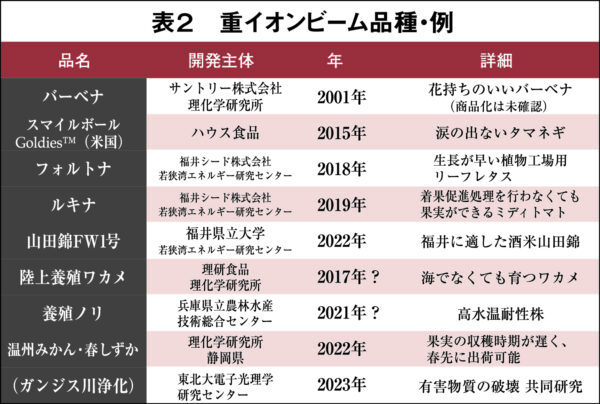 例えば、ハウス食品が2015年に「涙の出ないタマネギ」として「スマイルボール」を出している。重イオンビームで特定の遺伝子を壊し、人が切っても涙が出ないようにしたのだ。ただ、つくっているのは北海道の2軒の農家だけで、必ずしも広がっていない。心配なのが静岡県が開発している温州ミカンだ。ミカンは冬しか収穫できないが、春に出荷できるような品種を重イオンビームで開発するという話だ。2027年くらいから出回る可能性がある【表2】。