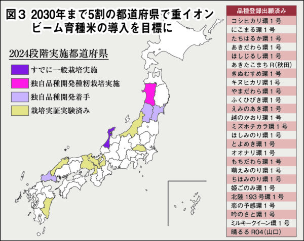 実は農水省は、秋田県だけでなく全国にターゲットを定めている。カドミウム低吸収米の品種を2025年までに3割、2030年までに5割の都道府県で導入することを計画し、毎年補助金を地方自治体に出している。100品種以上開発中で、すでに地方自治体が開発したものも含めて25品種以上が品種登録されている【図3】。25品種のうち4品種は九州、西日本の品種だ。秋田県のほか宮城県、山形県、山口県でも独自品種がつくられてしまった。最新品種が山口県の「晴るるR04」だ。山口県はカドミウム汚染地域は存在していない。なぜ山口県が動いているのかわからない。