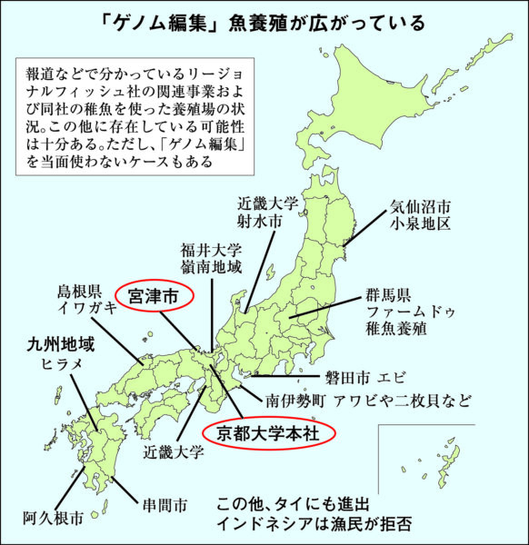 リージョナルフィッシュ社が開発した「可食部増量マダイ(マッスル真鯛)」や「高成長トラフグ(巨大トラフグ)」などのゲノム編集魚は、2021年から政府に届出が出され、流通を始めている。陸上養殖の舞台になっている京都府宮津市では、女性たちが立ち上げた市民グループ「宮津∞麦のね宙ふねっとワーク」が、ゲノム編集トラフグをふるさと納税返礼品から削除することや、海上養殖の禁止を求める署名活動をおこない、1万人をこえる署名を集めて提出。2023年には92団体・355人の賛同のもと「ゲノム編集魚を考える市民集会in京都」が開催され、「ゲノム編集」魚の問題提起がおこなわれている。しかし、同社にはさらなる公的支援が決まり、NTTと設立した合弁会社も含めて全国各地・海外に向けて事業を展開しつつある。