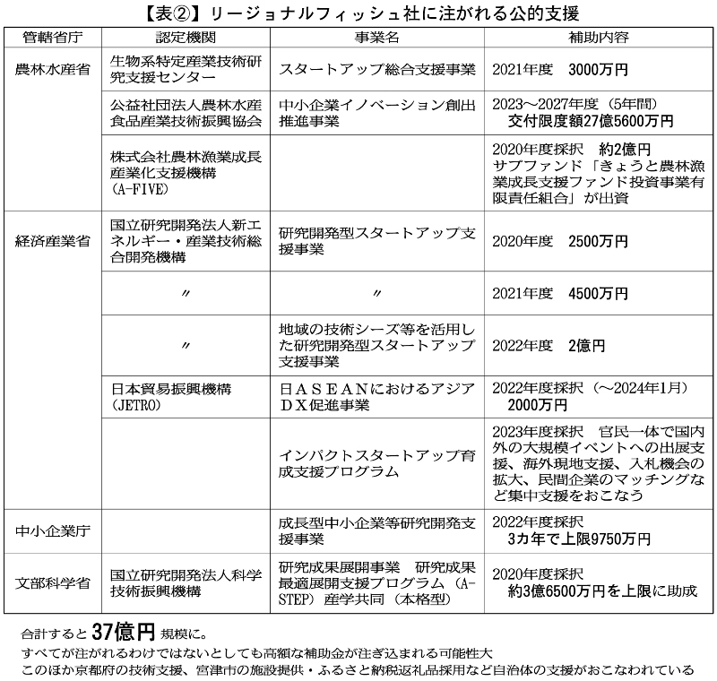 印鑰氏は「だれも買っていないのにリージョナルフィッシュ社がなぜこれほど拡大できるかというと公金だ」と指摘した。農林水産省、経済産業省、中小企業庁、文部科学省など各省庁から、「スタートアップ支援」などの名目で各種の補助金が同社に注がれており、採択された事業だけでも最大で合計37億円規模にのぼる【表②参照】。このうち、実際にどれだけの金額が支払われているのか明確ではないものの、多額の公金が投じられていることは間違いない状況となっている。さらに、京都府(技術支援、補助金)、宮津市(ふるさと納税返礼品への採用)など地方自治体もバックアップしている。印鑰氏は、リージョナルフィッシュ社が民間投資も40億円獲得し、スタートアップから本格操業に移行しつつある状況を明らかにし、その後ろ盾になっているのが公的資金・支援であることを指摘した。