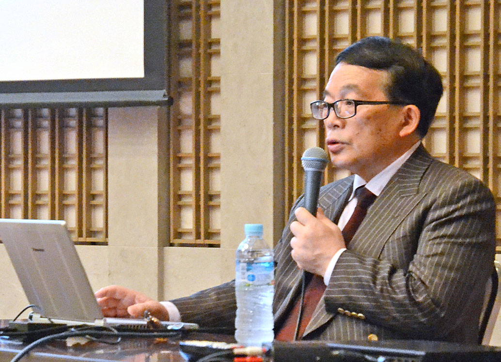 資料を見せながら講演する鈴木宣弘教授(17日、広島国際会議場)