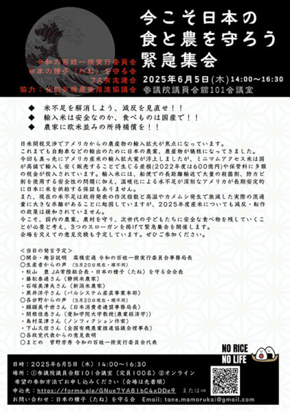「米不足を解消しよう、減反を見直せ‼」「輸入米は安全なのか、食べものは国産で‼」「農家に欧米並みの所得補償を‼」をスローガンに、令和の百姓一揆実行委員会・日本の種子(たね)を守る会・JA有志連合は6月5日、参議院議員会館101会議室で「今こそ日本の食と農を守ろう緊急集会」を開催する(協力・全国有機農業推進協議会)。