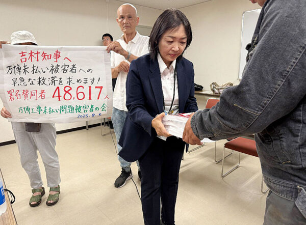 大阪・関西万博の海外パビリオン建設で工事代金の未払いがあいついで発覚している問題で、未払いを抱える下請業者が結成した「万博工事未払い問題被害者の会」が6日、約五万筆の署名を大阪府に提出し、早期の救済を求めた。署名は一刻も早く立て替え払いをすること、返済期間の長い無利子融資の緊急の実行を求める内容で、「開幕に間に合わせてほしいと懇願され頑張ったのに、工事金未払いのために連鎖倒産の危機、家族を含めた命と生活が危機に瀕している」と訴えている。7月6日の署名開始から約1カ月で5万筆が寄せられた。大阪府・市や万博協会は今なお「民間同士の問題」として立て替え払いを否定するばかりか、無利子融資も含めなんらの救済措置もとっていない。未払い期間が長期化すればするほど資金繰りは厳しくなる。業者たちは「今を乗り越えるために力を貸してほしい」と訴えている。