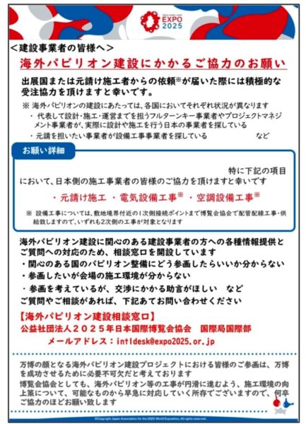 万博協会が海外パビリオン建設工事のために関連業者に配布した受注協力依頼のチラシ