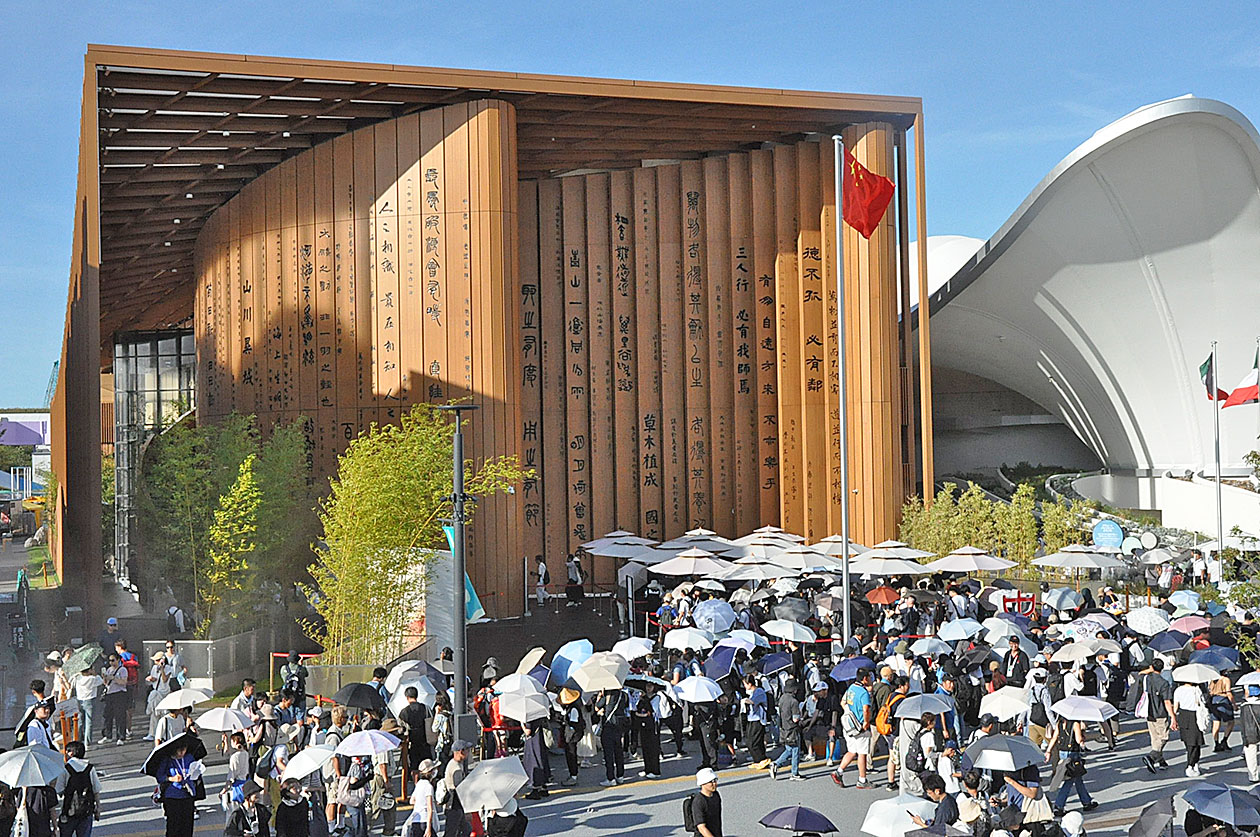 巨大な巻物を広げたような外観が特徴の中国館(大阪・関西万博会場)