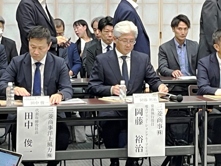 秋田県の法定協議会で洋上風力事業からの撤退を表明した三菱商事の役員ら(4日、秋田県庁。由利本荘・にかほ市の風力発電を考える会提供)