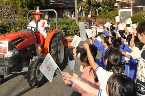 幟を立てた軽トラックを先頭に、トラクターは続々と農産物出荷場を出発。国道をへて商店街や住宅地のなかを意気高く行進し、町民に農家の思いを訴えた。商店街では店から手を振る人たちや、沿道に駆けつけてトラクターを見守る人など、住民から温かい声援が送られた。パレード終盤の六日市小学校近くでは児童クラブの子どもたちが「おいしいお米をありがとう!!」「がんばれ2025」など、それぞれ手作りの手旗を持って大きな声援で出迎えた。子どもたちの前でトラクターのロータリーが上がると、「動いた!」と大きな歓声が上がった。続く六日市保育所の前では保育園児たちが沿道に出て手を振って見送った。