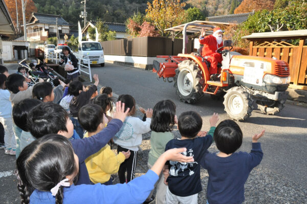 パレードをおこなうトラクターに保育所の園児たちも声援