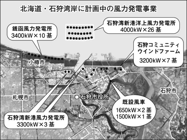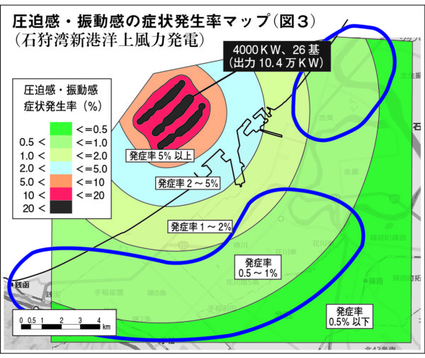 そして一番問題の石狩湾新港洋上風力(4,000㌔㍗×26基、図3参照)だが、石狩市のほとんんどの住宅地と札幌市北区屯田、手稲区の大部分、小樽市銭函市街地で0・5~1%をこえる住民に影響が出る(図3のだ円で囲った部分)。個人のリスクは小さくても人口が多いので、トータルとして約2,000人に健康被害の発症リスクがある。これだけ人口密集地の近くに大規模洋上風力発電がつくられるところは他にない。