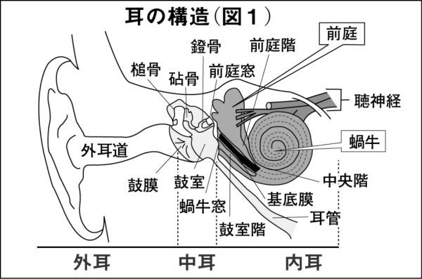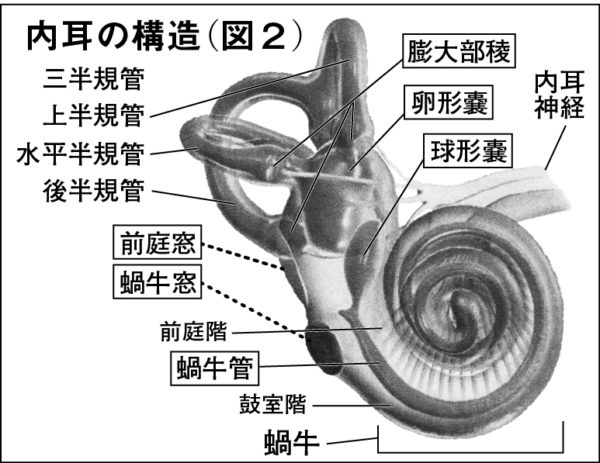 人間の耳は、鼓膜があって中耳があって、蝸牛というところで音を分析して脳に伝える(図1)。そこには前庭という機関があって、頭の傾き、頭の振動を検知して体の平衡機能を保っている。音は鼓膜から入ってきて、まず前庭窓を刺激し、中のリンパ液を振動させて、一部は蝸牛に伝わって音として感じる。前庭窓から蝸牛の間に卵形嚢(のう)、球形嚢という二つの器官があり、ここが振動を感じる感覚器官だ(図2)。入ってきた振動はまずこの二つを振動させてから蝸牛に入る。卵形嚢・球形嚢は低周波音でしか反応しない。