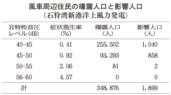 次に銭函風力発電(3,400㌔㍗×10基)だが、工業地帯からは少し離れている。石狩市樽川地区、札幌市手稲区山口団地のあたりで0・5~1%ぐらいの人に健康リスクが生じる可能性がある。計算すると300人以上に健康リスクが生じる可能性がある。全員が発症するとはいわないが、ゼロになることはありえない。