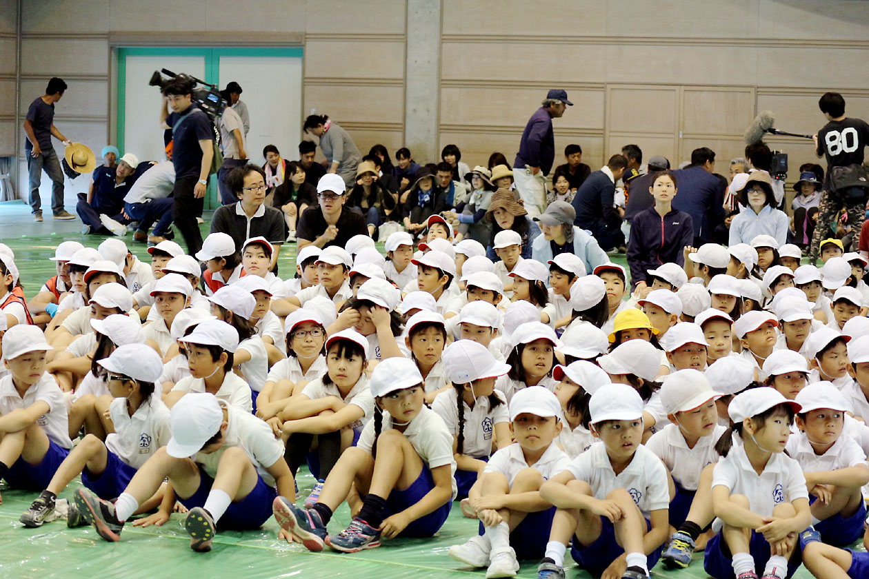 弾道ミサイル避難訓練で体育館に整列した児童や保護者(山口県内の小学校)