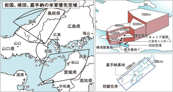 中国・四国地方にも米軍の管理する岩国空域がある。この空域は米軍岩国基地を中心にして山口、愛媛、広島、島根の4県にまたがり、日本海上空から四国上空までを覆っている。この空域内では日本の法律は一切適用されない。