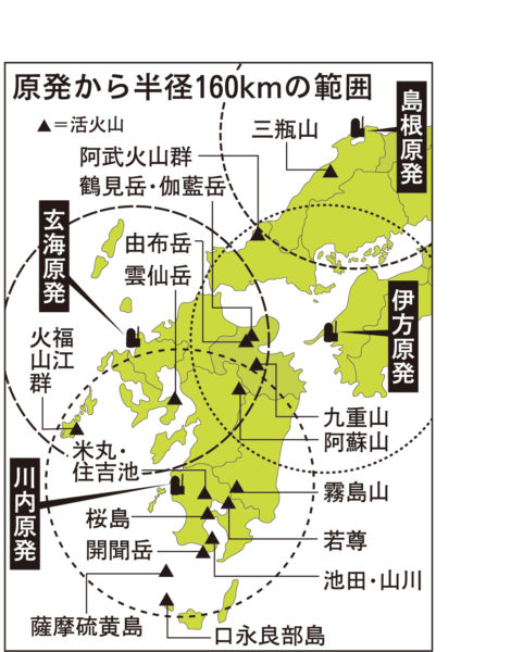 巨大噴火の影響は伊方原発にとどまらない。九州では阿蘇カルデラから160㌔以内に稼働中の川内原発1、2号機、来春にも再稼働予定の玄海原発3、4号機がある。 地震列島、火山列島である日本における原発建設の危険性は明白で、伊方3号機に限らず、すべての原発を停止させることが求められている。