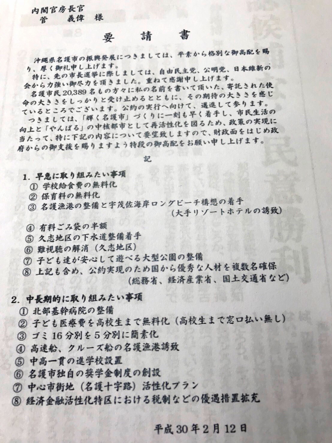 「国から優秀な人材を」 名護新市長が首相官邸に要望書 地方自治体の主体性はどこへ