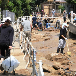 酷暑の復旧 スコップ抱え住民総出で土砂掻き出す 高校生・大学生ボランティアも貢献