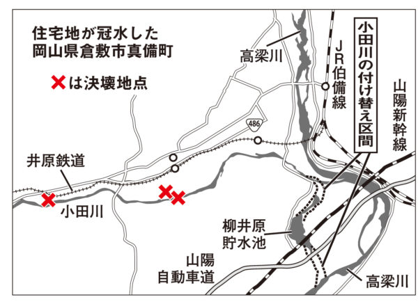 それは水害常習地としての歴史を忘れ、その自然条件を無視する無謀な都市政策にほかならない。この頃から専門家は、いったん集中豪雨がここを襲えば浸水被害は甚大なものになると警鐘を鳴らしてきたが、行政は聞く耳を持たなかった。2010年に策定された国土交通省高梁川水系河川整備計画(小田川と柳井原貯水池を結び、高梁川との合流地点を4・6㌔下流に移す)は、着工に至らないまま今回の豪雨災害となった。