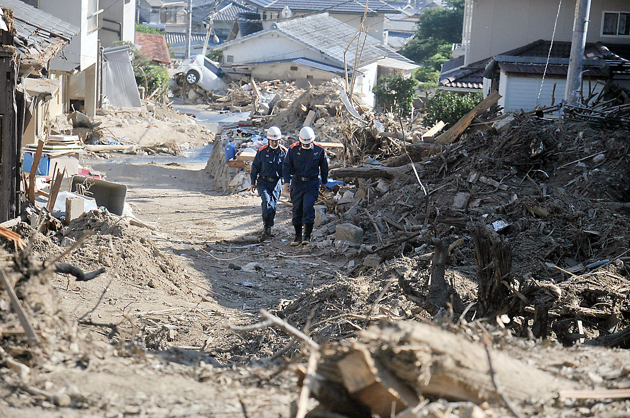 原形をとどめないまでに崩れた家の残骸の中を歩く消防隊員(14日、呉市天応地区)