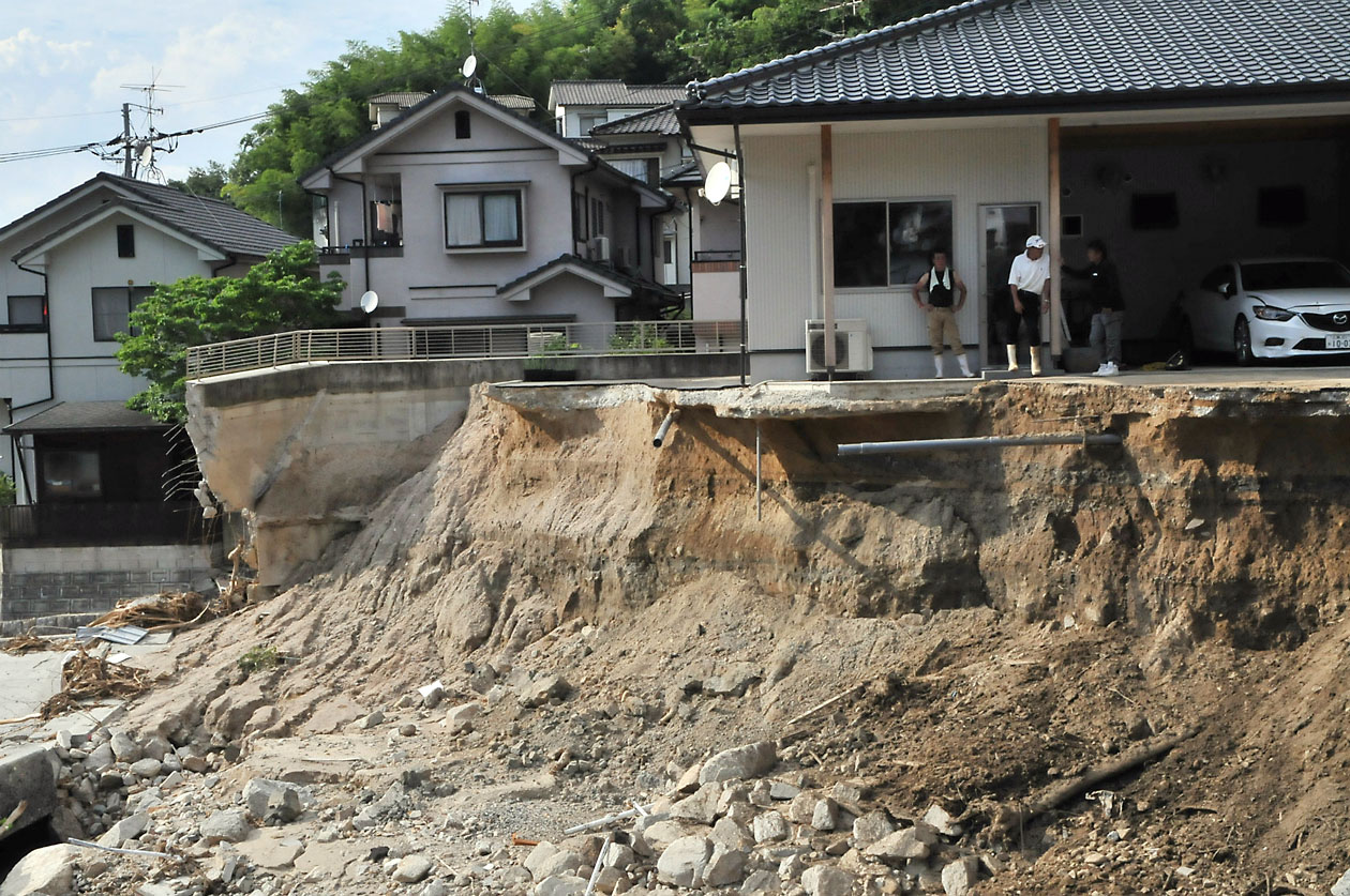 崩落した道路の淵に建つ住居(広島市安芸区矢野東)