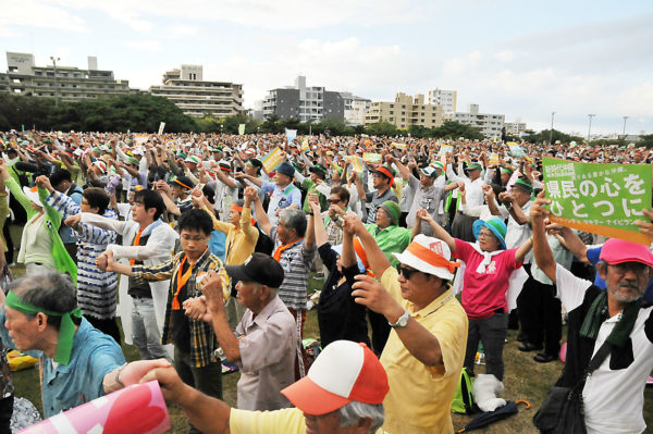 大きな拍手や指笛で沸くなか、翁長知事の「グスーヨー、負ケテーナイビランドー(みなさん負けてはなりません)! 私たちの子や孫を守るため頑張ろう!」「ウヤファーフジ(先祖)の思い肝に据えて、ヌチカジリ、チバラナヤーサイ(命懸けで頑張ろう)! 一丸となって頑張りましょう!」とのウチナーグチ(沖縄語)による掛け声が鳴り響き、会場の熱気は最高潮に達した。涙しながら拳を挙げたり、拍手する参加者も多く見られ、勝利を誓う厳粛な空気に包まれた。