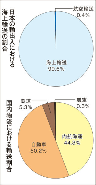 海をこえて運ぶ手段は飛行機か船しかない。飛行機は速いが、一度に運べる量は圧倒的に船が勝っている。たとえば横浜からサンフランシスコまで、飛行機なら約10時間で行けるところを船なら約2週間かかる。だが、飛行機が一度に運べる貨物量はトレーラーのコンテナ換算で1個にすぎず、船は一度に約2万個も運べる。実際、日本は輸出入量の99・6%を外航船による海上輸送に頼っている。