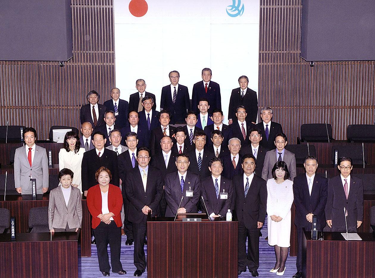 平成27年の市議選当選後の初議会記念写真
