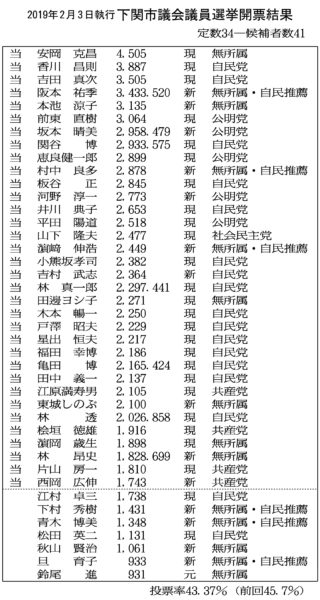 全有権者の半数にそっぽを向かれ、市民から浮き上がった新市議会がスタートする。今回の選挙結果は、安倍一強体制のもとで安倍・林の支配におもねり、二元代表制の建前すら放棄した下関市議会のありように、市民が不信任を示したものとなっており、このことは当落にかかわらず41陣営全体の責任として突きつけられている。