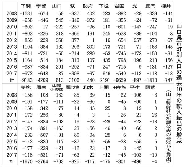阿武町の2008~2017年までの10年間の人口動態を見ると、出生が153人、死亡が850人で自然動態はマイナス697人、一方転入は1094人、転出は1098人で社会動態はマイナス4にとどめている。2011年は26人のプラスとなった。県内の他市町の社会動態が減少傾向にあるのに比べても、増加傾向は顕著である。
