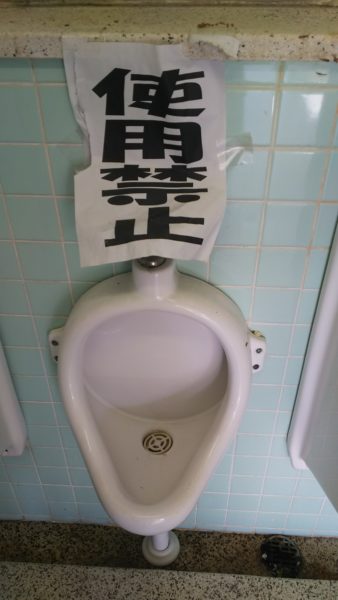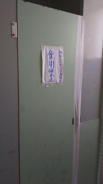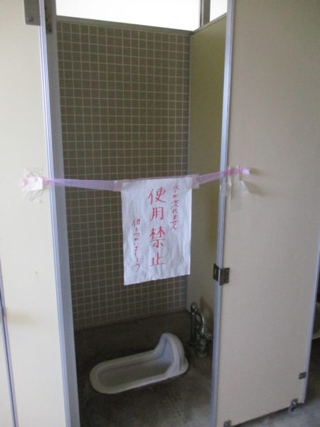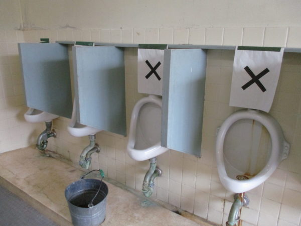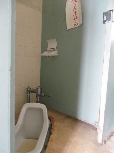 今「使用禁止」のままおかれているものは、申請はしているが順番待ち状態、学校側の判断で工事申請を出していないもの、構造的に修理ができる状態にないものになる。とくに、構造的な理由で修理ができないというのはトイレが古すぎるためだ。見せていただいたもののなかには、フラッシュバルブがコンクリートの壁に埋め込んである構造になっており、壁ごと崩さなければ原因の特定もできないといったものや、部品を交換すれば直るがメーカーが製造をやめてしまっている古い型のもので修理のしようがないものなどがあった。市内のほとんどの校舎が築30年~40年以上経過している。壊れていなくても石のように固まってしまっている尿石の除去にどの学校も苦労している。また、男子小便器では配タンク式がまだ多い。これは用を足したあとにすぐに流すのではなく、時間がたてば上のタンクから自動的に水が流れる仕組みになっている。自分で押すボタンはない。これが臭いや尿石のもとになりやすいそうだ。臭いが廊下まで漂っていることに先生方も悩んでおり、ひどい学校ではトイレ前の教室は使わないようにしているところまであった。