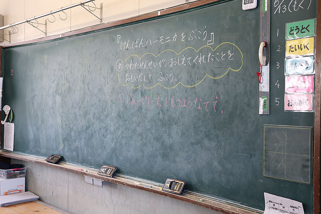 ある学校の一年生の教室の黒板。50年以上も使っているため、黒板消しで拭いても白が浮き出てくる