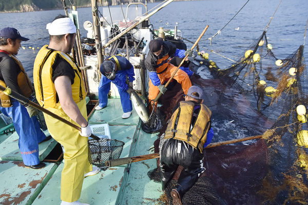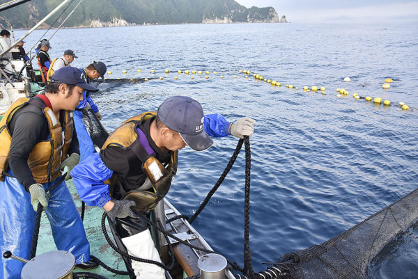 5時30分になると漁船に全員が乗り込み、網を仕掛けてあるポイントに向かう。定置網とはその名の通り海中の定まった場所に網を固定して、回遊している魚を網で作られた垣根(垣網)で誘い込み、それを袋状の袋網で回収する漁法だ。底引き網や巻き網などのように漁船で網を曳いて群を追う漁とは違い、「待ち」の漁だ。定置網は代代引き継がれてきたポイントに長年設置してあり、その日ごとに袋網だけを巻き上げて魚を回収する。