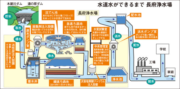 長府浄水場では「急速ろ過方式」で水道水をつくっている。概算で、緩速ろ過の場合、水が砂の層を1㌢通るのに3分かかるが、急速ろ過では6秒で1㌢通るため、より速く、多くの水をつくることができる。人口が増加していく時期にとり入れられた方式だ。場内にある緩速ろ過池(4池で2万㌧のろ過能力を持つ)は水需要の減少により2014年11月から休止している。