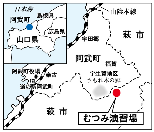 むつみ演習場側(手前)から見た宇生賀地区。4集落73戸の農家で農事組合法人「うもれ木の郷」をつくっている。(提供・うもれ木の郷)