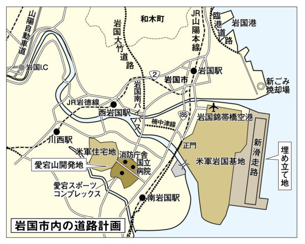 A 基地周辺の川下地区では、南バイパスから住宅地のど真ん中を抜けて米軍基地正門に一直線に抜ける都市計画道路「楠中津線」を整備するために多くの住民を立ち退かせた。幅22㍍の道路で川下地区は南北に分断されることになる。それに連結して愛宕山の下を通る南バイパスは由宇まで伸ばし、東は大竹までつなげて高速道路と連結させる計画だ。これらの道路網は有事の際には、国道188号線の混雑を避けて移動するための米軍専用道路に簡単に変わる。