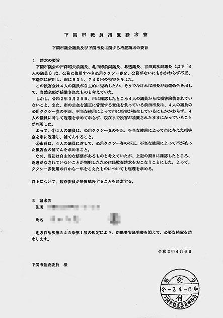 下関市議会議長・副議長のタクシー券不正使用 調査チームが住民監査請求