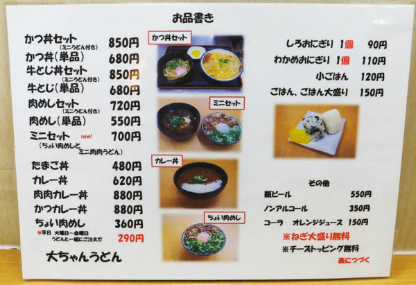 もっとも人気なのは特選セットメニューで、各種丼物(一品物より少量)付きのそば・うどん・ざるそばセット(麺類は一品物と同じ)で各800円。和風ちゃんぽんセットはいなり・ご飯・おにぎりのどれか一つがついて600円とボリュームがあり美味しいと、リピーターが多い。いずれも税込価格。