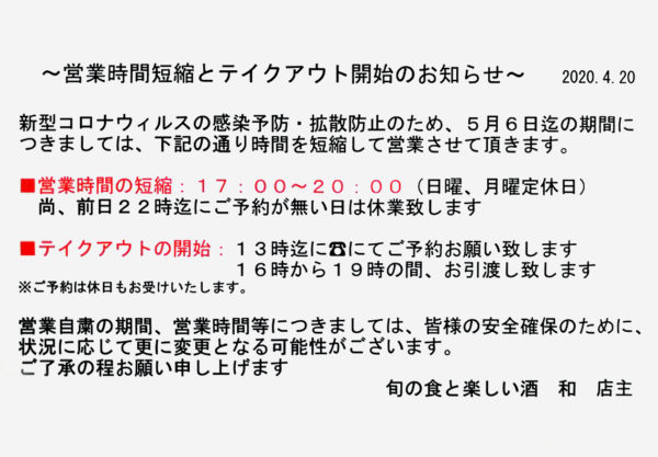 豊前田の中心地から少し離れた処に佇む『和(なごみ)』。丁寧に仕込まれた料理と、日本全国の希少な日本酒・焼酎もとりそろえている。21日からテイクアウトを始めた。
