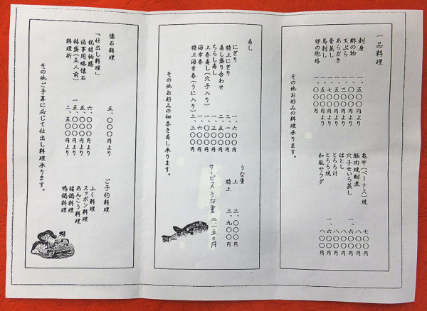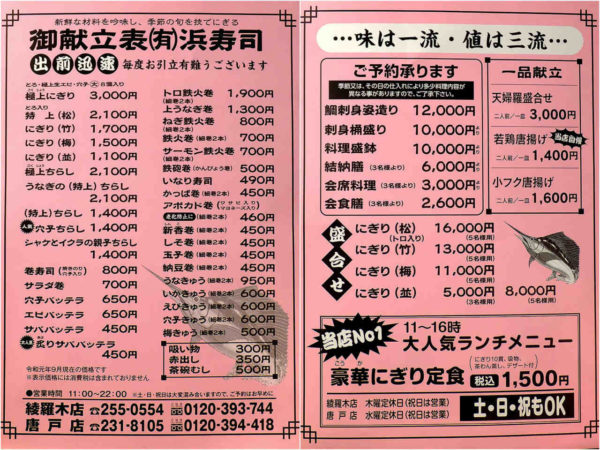 メニューは上にぎり2300円(7貫)、特上にぎり3400円(7貫)、おまかせにぎり5000円(その日のおすすめ10貫)、太巻き寿司900円(1本)、上太巻き1600円(1本)。サイドメニューも、あわびバター焼き(2800円)、天然刺身五種盛り(1800円)、地魚西京焼き(980円)、関門たこ天麩羅(820円)、ほたるいか磯部揚げ(820円)、国産あさりバター焼き(980円)、生しらうお磯部揚げ(750円)など20種のメニューの中から注文することができる。