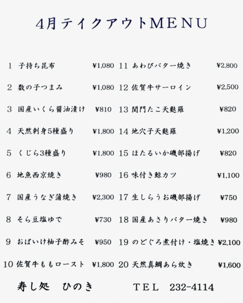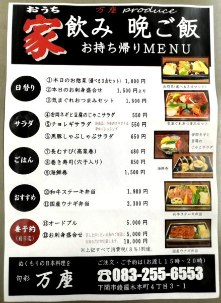 JR綾羅木駅から中山神社に向かって徒歩5分の、閑静な住宅街のなかにある『万座』。いつもは安岡の漁師の獲った魚など、店長が選んだ新鮮な魚介類を味わおうと予約客の絶えないこの店も、4月22日(水)からテイクアウトのみの営業となった。
