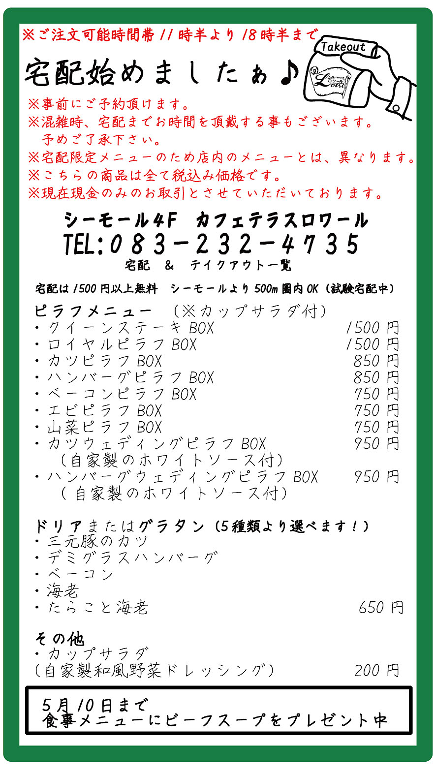 5月10日まで、食事メニューにビーフスープをプレゼント中だ。事前予約も可能。現在、シーモールより500㍍圏内を対象に、試験宅配も始めている。宅配は1500円以上無料となっている。