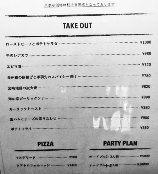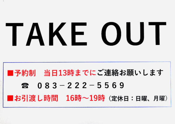 テイクアウトは当日午後1時までに電話予約が必要。ひき渡し時間は午後4時から7時のあいだ。