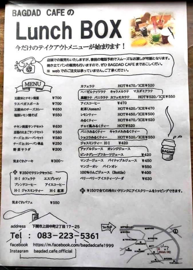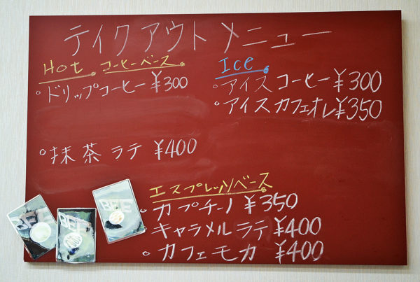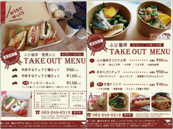 ランチメニューが持ち帰れる。値段は税込500円。ランチの時間に来店して注文してもいいし、電話で注文しておけばすぐに渡せる。その他、ふぐフライ定食(800円)、牛すじ肉のカレーライス(700円、プラス100円でカツをトッピングできる)、ハヤシライス(700円)エビピラフ(700円)やナポリタン(700円)、焼きそば・焼きうどん(各600円)など多数ある。コーヒーをはじめ飲み物もテイクアウト可能だ。