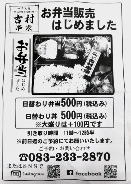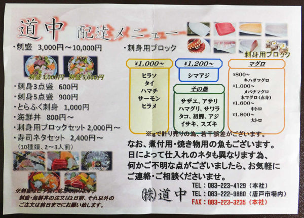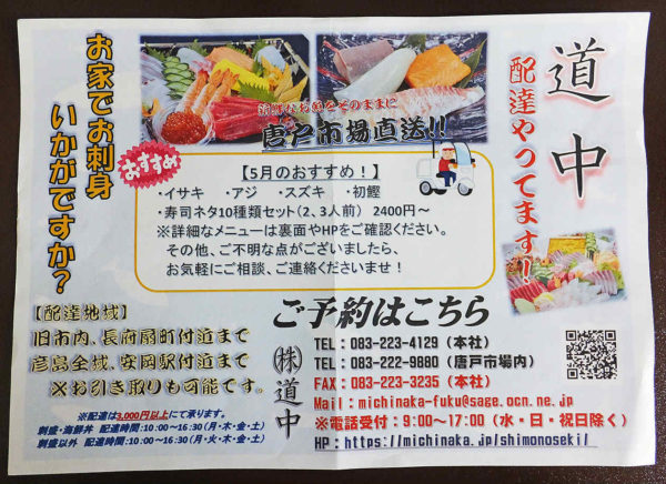 配達可能な範囲は、下関駅周辺から唐戸、東駅など半径2㌔㍍ほどという。配達時間は午前11時~午後2時(出前ができない日あり。問い合わせを)。電話予約は午前10時10分から可能。