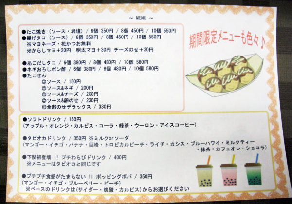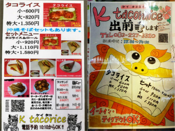 テイクアウトメニューは、タコライス小…600円、大…820円、特大…1350円のほか、沖縄そばセットもある。セットメニューはタコライス&ロール小…920円、大…1110 円、特大…1580円。そのほかタコサンド…400円、タコロール…400円、ミニ太郎…280円もある。
