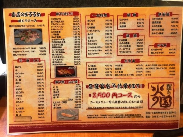 地鶏料理の激戦区博多にて修行を積み、2015年に下関に凱旋した。炭火でじっくりと丁寧に一本一本心を込めて焼きあげた串焼が自慢の居酒屋。