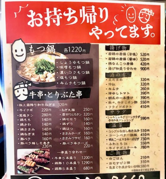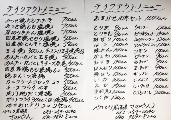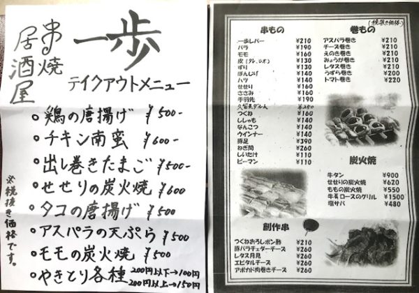 しかも、新型コロナが収束するまでは、テイクアウトの焼き鳥各種は、200円以下→100円、200円以上→150円と出血大サービス中だ。