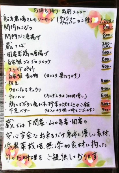 現在はテイクアウト・デリバリーのみで営業中。一番のおすすめは、甘辛いたれとピリ辛のスパイスがきいた「蔵てば」(1本200円)。そのほか、船方農場さんのソーセージ(チョリソー、ペッパー・1200円)、関門たこぶつ(800円)、関門だこ唐揚げ(800円)、国産若鶏の唐揚げ(600円)、自家製ゴロゴロコロッケ(600円)、クセになるキュウリ(400円)、チャーハン(600円、キムチ入りは100円増し)、鶏とゴボウと気まぐれ野菜の炊き込みご飯(500円)などがテイクアウト・デリバリーできる。デリバリー可能な地域は市のごちそう宅シーの範囲内。