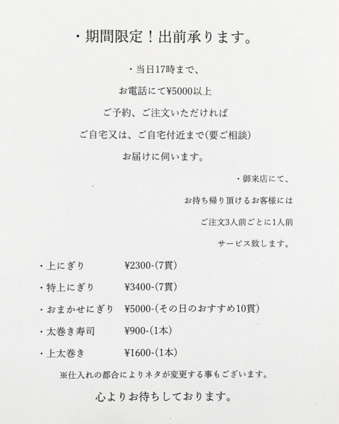 期間限定で出前もおこなっており、当日の午後5時まで、電話にて5000円以上、予約・注文すると自宅または自宅付近まで(要相談)配達が可能だ。来店して持ち帰る場合は、注文3人前ごとに1人前サービスがある。