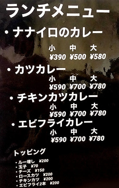 メニューはナナイロのカレー(小390円、中500円、大580円)、カツカレー(小590円、中700円、大780円)、チキンカツカレー(小590円、中700円、大780円)、エビフライカレー(小590円、中700円、大780円)となっているほか、トッピングとしてルー増し(200円)、玉子(70円)、チーズ(150円)、ロースカツ(200円)、チキンカツ(200円)、エビフライ二本(200円)もある。カレーは甘めで家庭的な味付けになっている。「本来はもつ鍋屋なので、落ち着いたらぜひ食べに来て下さい」とのこと。
